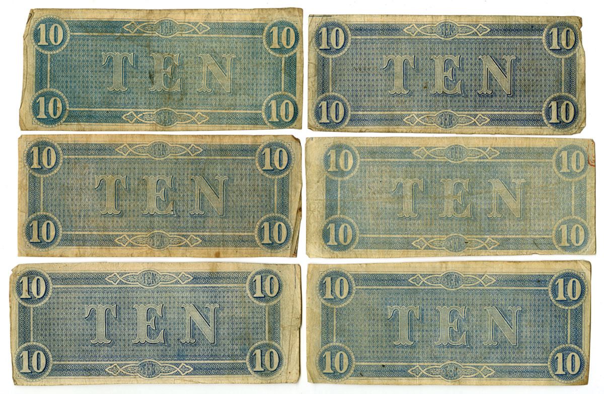Richmond, Virginia, 1864. $10, P-68 (6) T-68 SL#69, Issued Banknote Group, Black on red underprint with Artillery horseman pulling cannon at center with portrait of M.T. Hunter at lower right, Back is blue with TEN printed at center, Notes range from VF to Choice VF condition. (6). Sold "AS IS" no returns accepted.