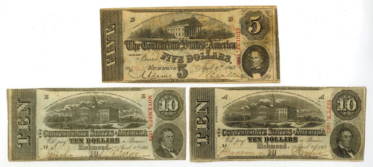 Richmond, Virginia, 1863. Lot of 3 Issued Banknotes, Includes: $5, T-60; and, $10, T-59. Notes range from Fine to XF condition. (3). Sold "AS IS" no returns accepted.