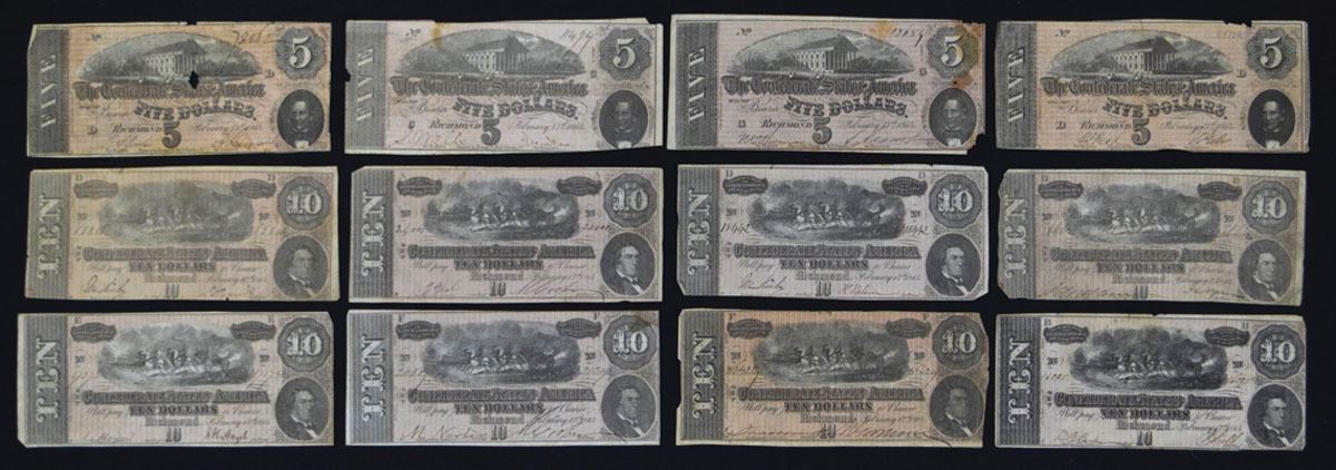 Richmond, Virginia, Series of 1864. Lot of 12 Issued Banknotes, Includes: $5, T-69 (4); $10, T-68 (8). Notes printed with black text and vignettes with red underprint, with portraits of Confederate men at right, Notes range from VG to VF condition, a few with small problems, and small tears . K&B. (12). Sold "AS IS" no returns accepted.