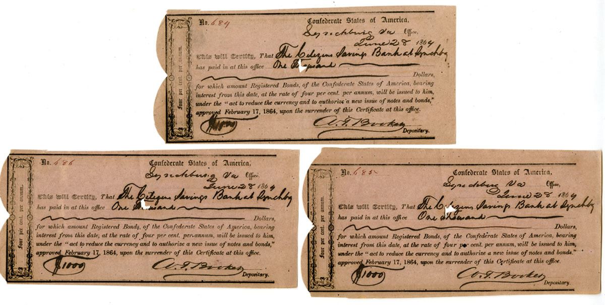Lynchburg, Virginia. 1864. $1000 I/U 4% Interim Depository Receipts issued to the Citizens Savings Bank at Lynchburg, with Sequential Serial Numbers, Black print on tan/pink paper with simple black border, Uniface check sized certificates, S/Ns 684, 685, & 686, Fine to XF condition with ink burns, Signed by W. T. Booker as Depositary. Printed form with handwritten entries, typical of Confederate debt restructuring efforts during the final year of the Civil War. (3). Sold "AS IS" no returns accepted.