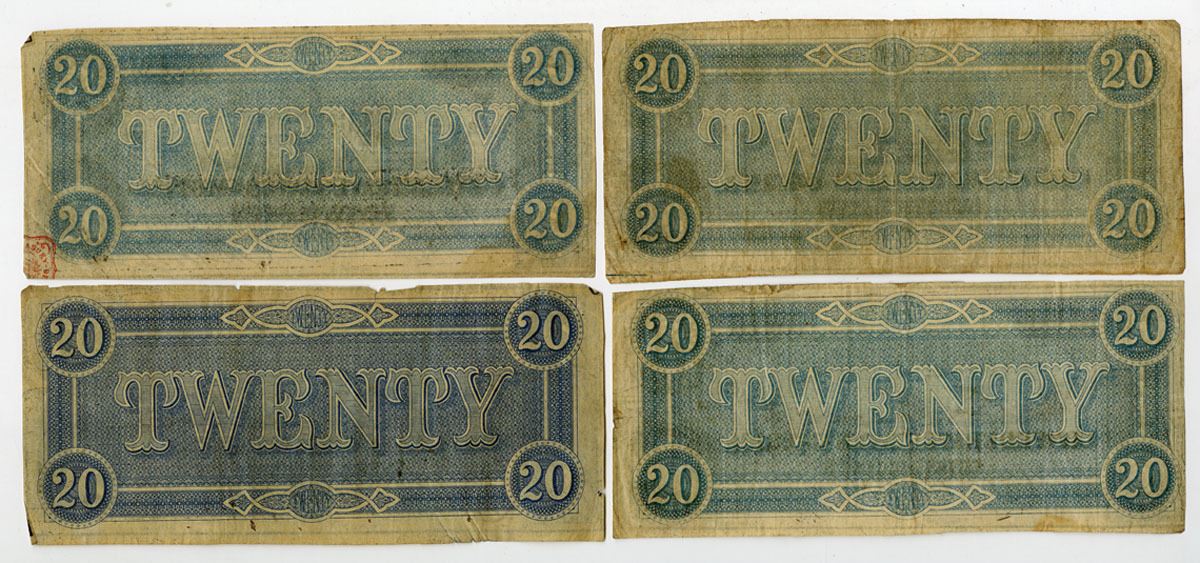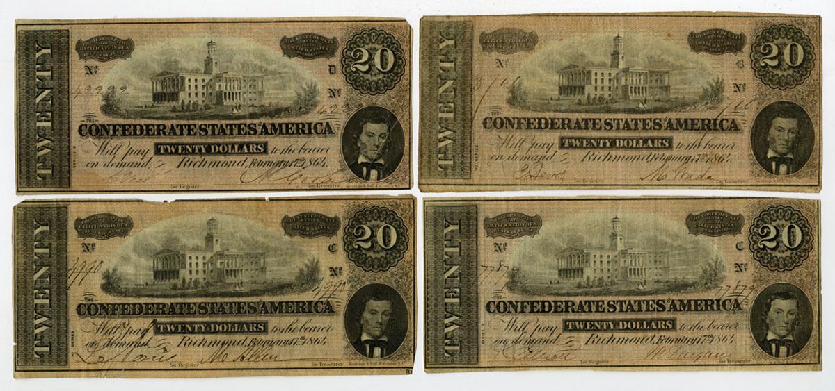 Richmond, Virginia, 1864. $20, P-69 (4), T-67, Issued Banknote Quartet, Black with red underprint with Capital at Nashville, Tennessee at top center with portrait of A.H. Stephens at lower right, Notes are Series 2, Series 3, VII Series, and XI Series, Banknotes range from Choice Fine to Choice VF condition, K&B. (4). Sold "AS IS" no returns accepted.