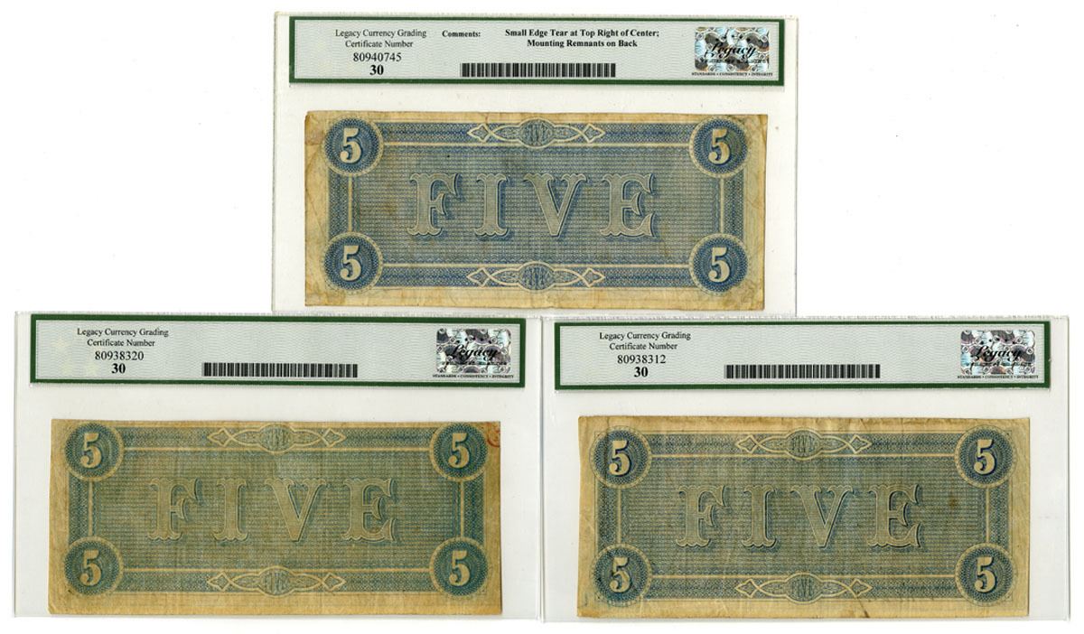 Richmond, Virginia, February 17, 1864. $5, P-67 (3) SL#68 T-69, Issued Banknote Trio, Black with red underprint, Capitol at Richmond at center with portrait of C. G. Memminger at bottom right, Back is blue, All notes are Legacy graded Very Fine 30 - one has comment "Small Edge Tear at Top Right of Center; Mounting Remnants on Back," K&B. (3). Sold "AS IS" no returns accepted.