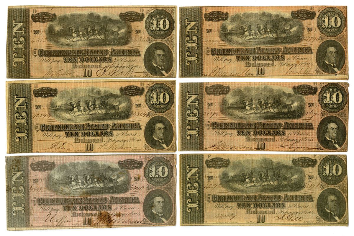 Richmond, Virginia, Lot of 6, 1864. $10, P-68 (6) T-68 SL#69, Issued Banknotes, Includes "1st Series" (2); "3 Series"(2); and, "5 Series" (2). Black on red underprint with Artillery horseman pulling cannon at center with portrait of M.T. Hunter at lower right, Back is blue with TEN printed at center, Notes are in Fine to Choice Fine condition. Keating & Bell. (6). Sold "AS IS" no returns accepted.