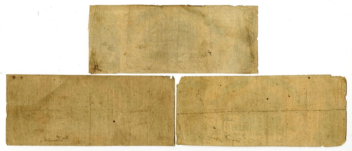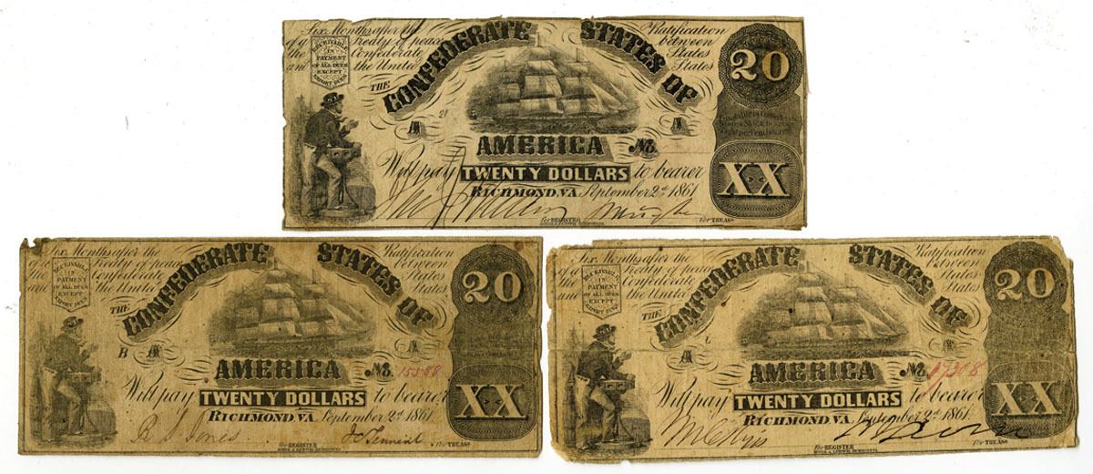 Richmond, Virginia, 1861. Lot of 3 C.S.A. Banknotes, all the same: $20, T-18a, I/C Banknotes, Black print with large ship at center, man at bottom left, Includes S/Ns 7204; 15588; and 17308. All have been cancelled at center. Fine condition. Hoyer & Ludwig. (3)