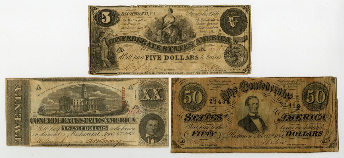 Richmond, Virginia, 1861-1864. Lot of 3 Issued Banknotes, Includes: September 2, 1861, $5, P-19c, SL#19, T-36, S/N 127122, J. T. Paterson & Co.; April 6, 1863, $20, P-61, SL#62, S/N 76863, K& B; February 17, 1864, $50, P-70, SL#71, T-66, S/N 21438, K&B. Notes range from Fine to VF+ condition. (3). Sold "AS IS" no returns accepted.