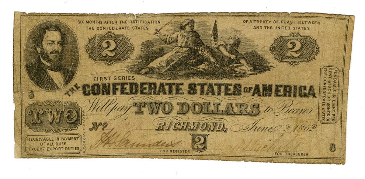 Richmond, Virginia, 1862. $2, P-41 T-42, SL#45, Issued Banknote, Black print with portrait of J. Benjamin at left and personification of the South striking down the Union at top center, S/N is illegible pp 8, VG condition, B. Duncan.