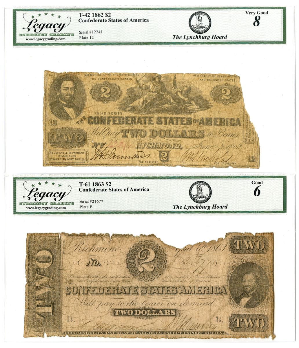 Richmond, Virginia, 1862 and 1863. Lot of 2 Issued Banknotes, Includes: 1862 $2, T-42, S/N 12241 Plate 12, Legacy graded Very Good 8 with comments, "Edge Tears and Damage," B. Duncan; 1863 $2, T-61, S/N 21677 Plate B, Legacy graded Good 6 with comments "Edge Splits, Tears, and Damage," K&B. (2).