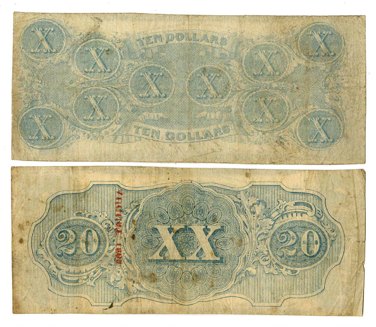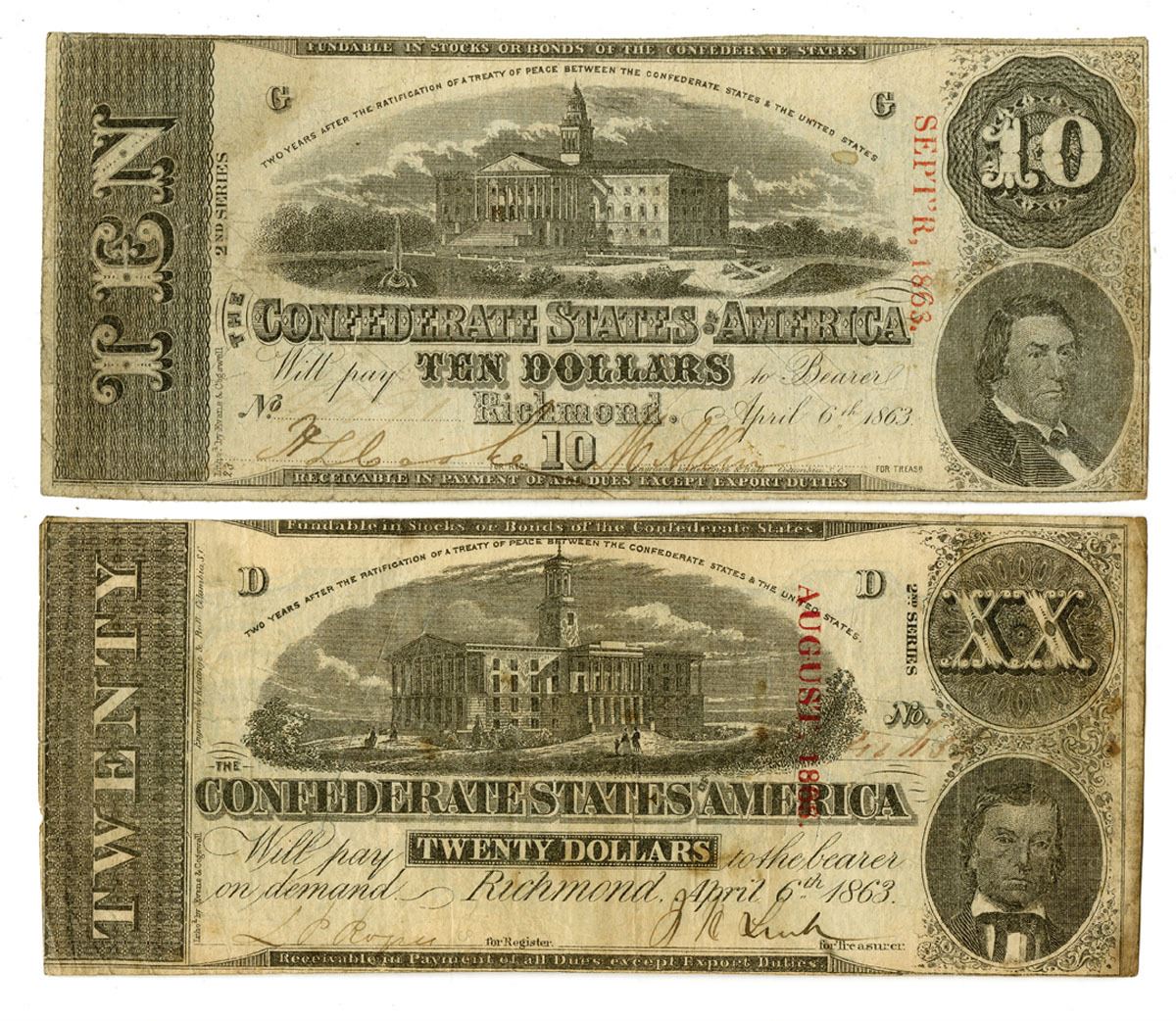 Richmond, Virginia, 1863. Lot of 2 I/C Banknotes, Includes: $10, P-60b SL#61 T-59, K& B; $20, P-61b SL#62 T-58, K&B. Both are Cut Cancelled at center, Notes are in VF to VF+ condition. (2).