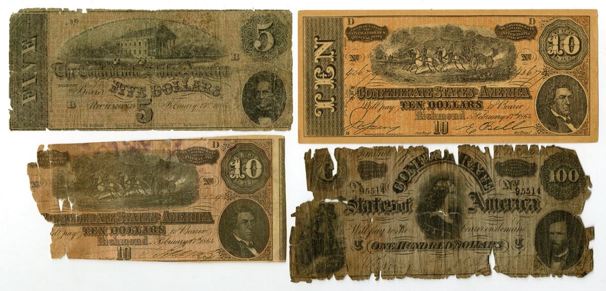 Richmond, Virginia, 1864. Lot of 4 I/U Banknotes, Includes: 5 Dollars, P-67 SL#68; 10 Dollars, P-68 (2), SL#69; 100 Dollars, P-71 SL#72. Notes are in Good to VF condition with damage. (4). Sold "AS IS" no returns accepted.