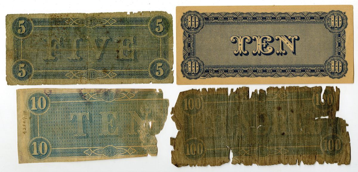 Richmond, Virginia, 1864. Lot of 4 I/U Banknotes, Includes: 5 Dollars, P-67 SL#68; 10 Dollars, P-68 (2), SL#69; 100 Dollars, P-71 SL#72. Notes are in Good to VF condition with damage. (4). Sold "AS IS" no returns accepted.