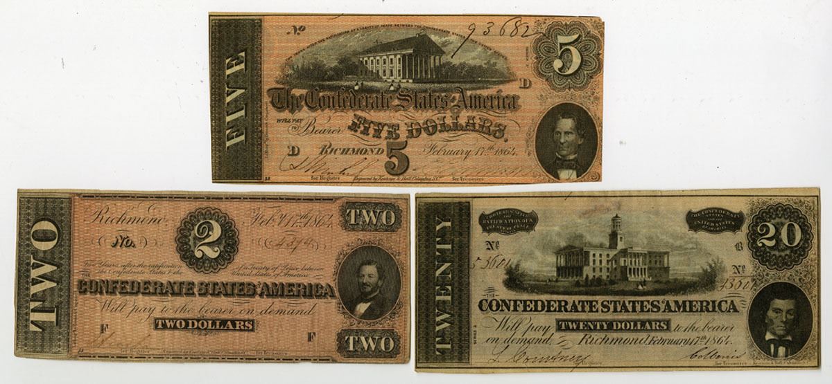 Richmond, Virginia, 1864. Lot of 3 Issued Banknotes, Includes: 2 Dollars, P-66, T-70, SL#67; 5 Dollars, P-67, T-69, SL#68; 20 Dollars, P-69, T-67, SL#70. Notes are in VF to Choice XF condition and printed by K&B. (3). Sold "AS IS" no returns accepted.
