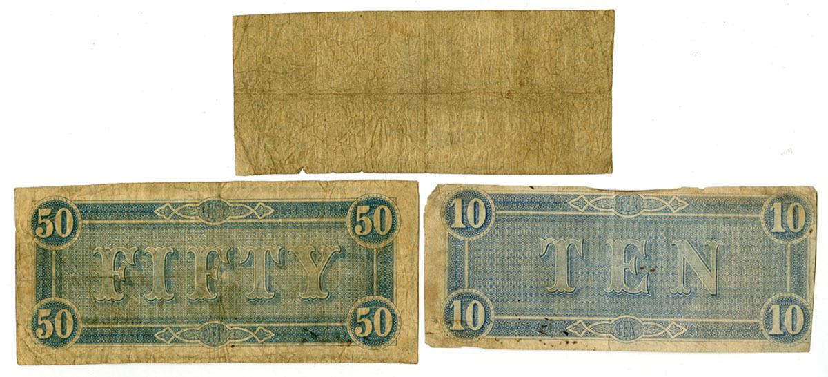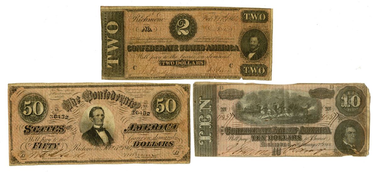 Richmond, Virginia, 1864. Lot of 3 Issued Banknotes, Includes: $2, P-66a SL#67 T-70, S/N 3940 pp C, K& B; $10, P-68 SL#69, S/N 48577 pp D, K& B; $50, P-70 SL#71 T-66, S/N 36432 pp A, K&B. Notes are in VG condition. (3).