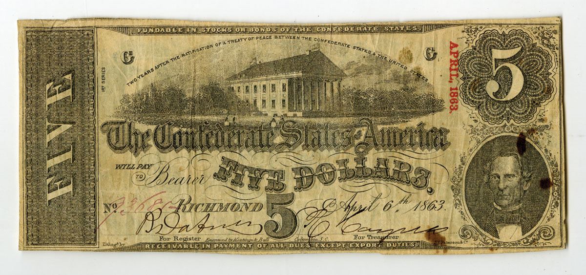 Richmond, Virginia, 1863. $5, P-59b T-60 SL#60, Issued Banknote, Black printing with Capital at Richmond at top center with portrait of C. G. Memminger at right, Back is blue with denomination repeated 5 times, First Series S/N 93685 pp G, Good to Fine condition, Engraved by Keating & Ball, Lithographed by J. T. Paterson.