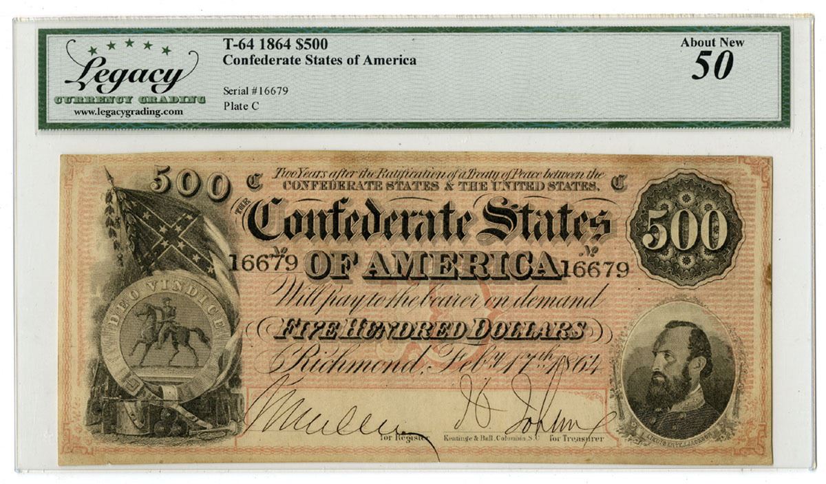 Richmond, Virginia, February 17, 1864. $500, T-64, SL#73, P-73, I/U Banknote, Black with red underprint, Confederate seal with equestrian statue of George Washington at left and portrait of Gen. Stonewall Jackson at right, S/N 16679 pp C, Legacy graded About New 50 with comments "Small Edge Tears; Mounting Remnants on Back; Small Stain at Right Edge," K&B.