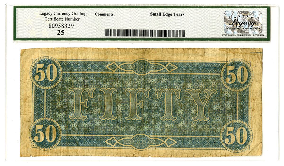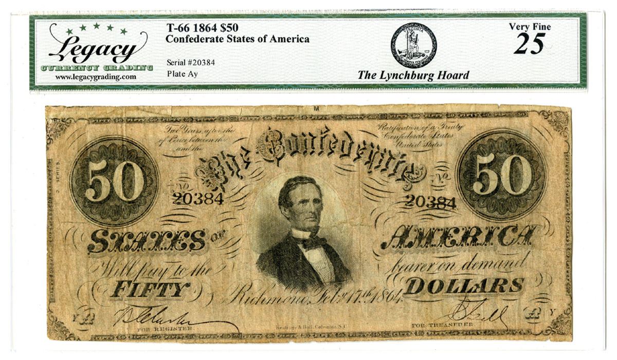 Richmond, Virginia, February 17, 1864. $50, P-70, T-66, SL#71, Issued Obsolete Banknote, Black with red underprint and portrait of Jefferson Davis at center, S/N 20384 pp Ay, Legacy graded Very Fine 25 with comment "Small Edge Tears," K&B.