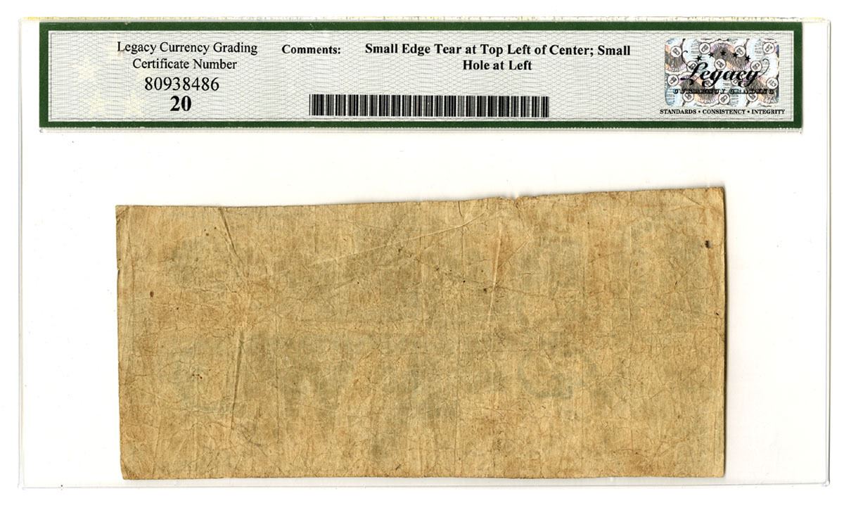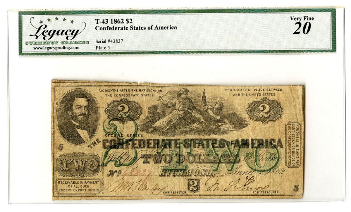 Richmond, Virginia, June 2, 1862. $2, P-42, T-43, SL#46, Issued Banknote, Black with green underprint, Portrait of J. Benjamin at top left and personification of the South striking down the Union at center, Uniface note, S/N 43837 pp 5, Legacy graded Very Fine 20 with comments "Small Edge Tear at Top Left of Center; Small Hole at Left," B. Duncan.