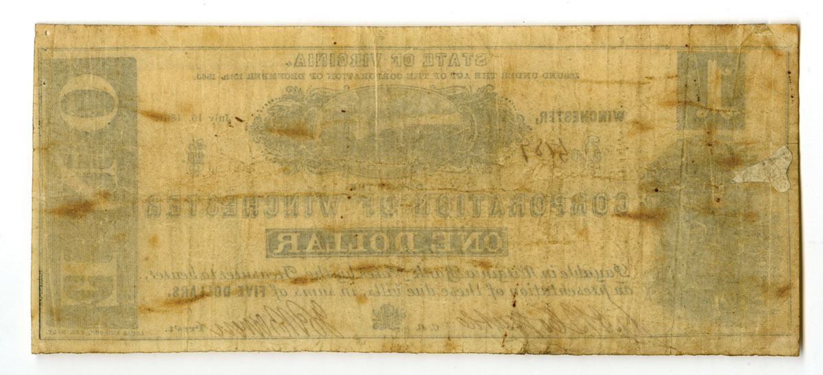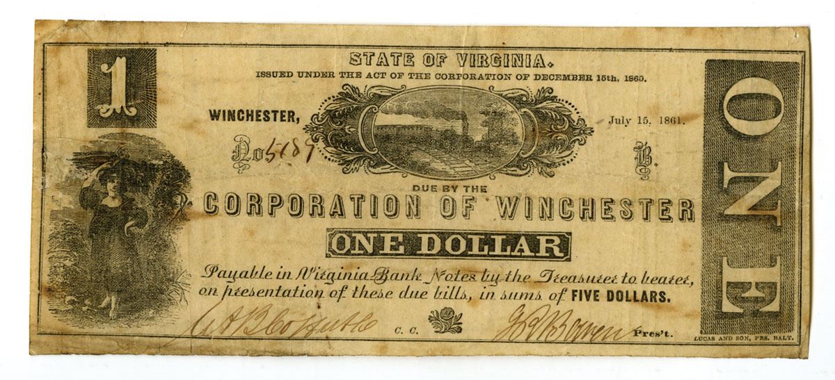 Winchester, Virginia, 1861. $1 Issued Municipal Emergency Note, produced during the early Civil War period when many Southern towns issued their own circulating currency due to shortages of specie and federal money. Typical design style for the period with simple engraved layout and municipal authorization text. Note is in Fine to VF+ condition with minor stains.