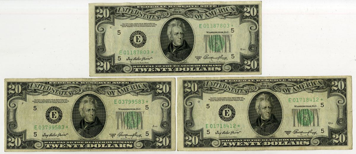 Richmond, Virginia, 1950. $20, P-440a (3), Series 1950A, Fr.# 2060-E*, Issued Star Note Trio, Priest | Humphrey Signatures, Green seal at right, S/Ns E01187803* pp E107/827, E01718412* pp Q112/838, and E03799583* pp J145/879. Notes range from VF to XF condition. (3). Sold "AS IS" no returns accepted.