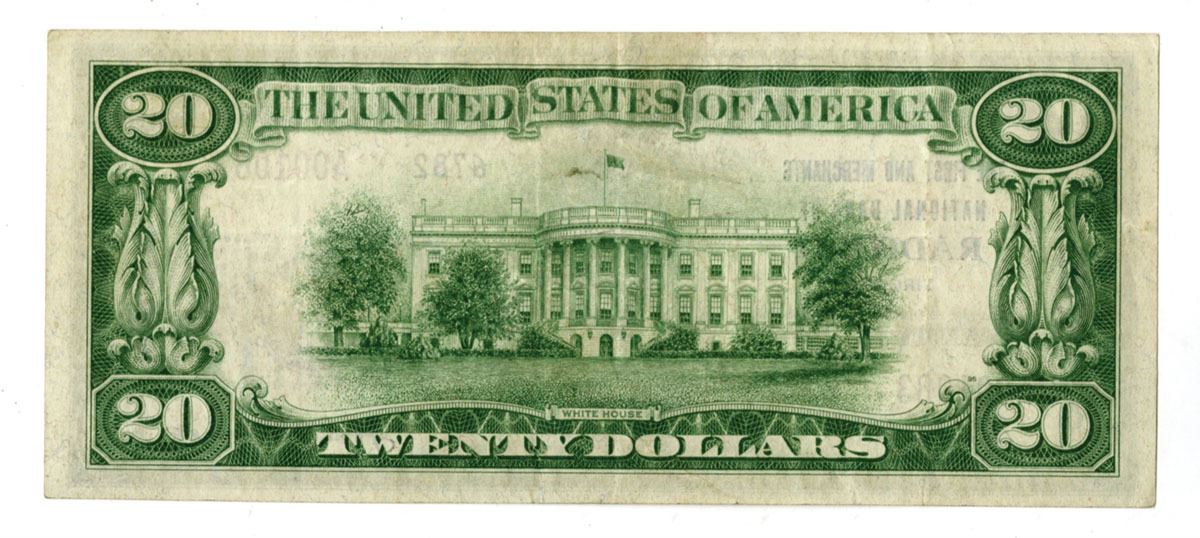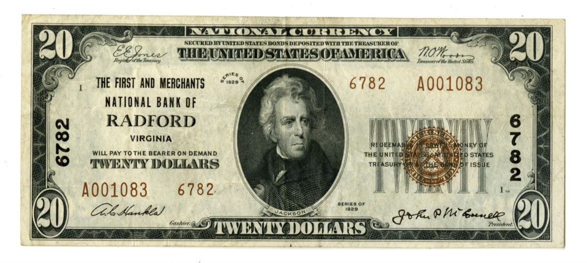 Radford, Virginia, 1929. $20, Series of 1929, Ch# 6782, Fr.# 1802-2, Issued National Banknote, Jones | Woods Signatures with brown seal at right, S/N A001083 pp I, Choice VF to XF condition. Only 8 notes are known on this bank, all small type. This is the only T2 $20 known as well as the only T2 of any denomination known on the bank.