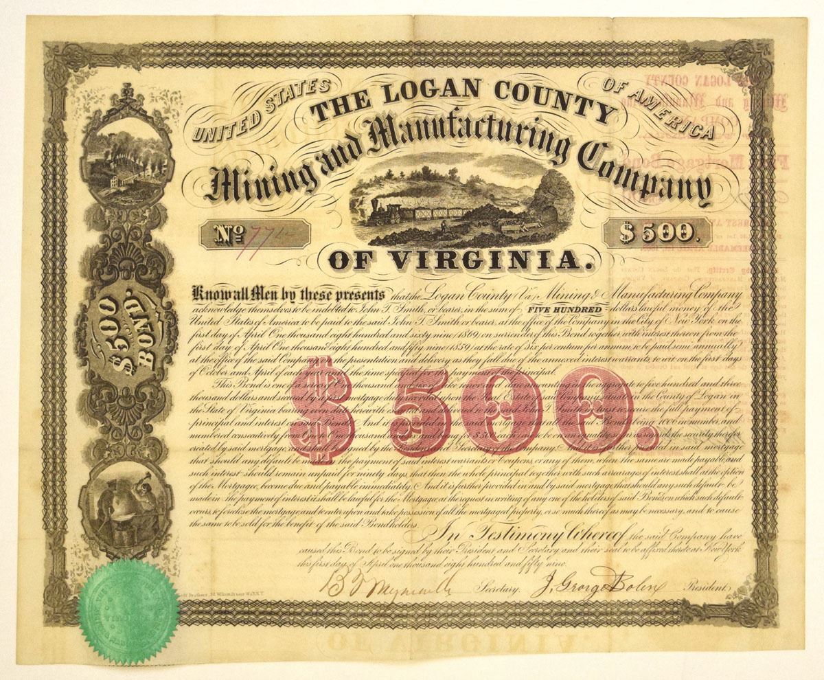 Virginia, 1859. $500 I/U 6% Bond, Black print with ornate black border and red underprint, Locomotive at top center with smaller vignettes in panel along left side, Green sela at bottom left corner, S/N 771, VF to XF condition with minor stains.