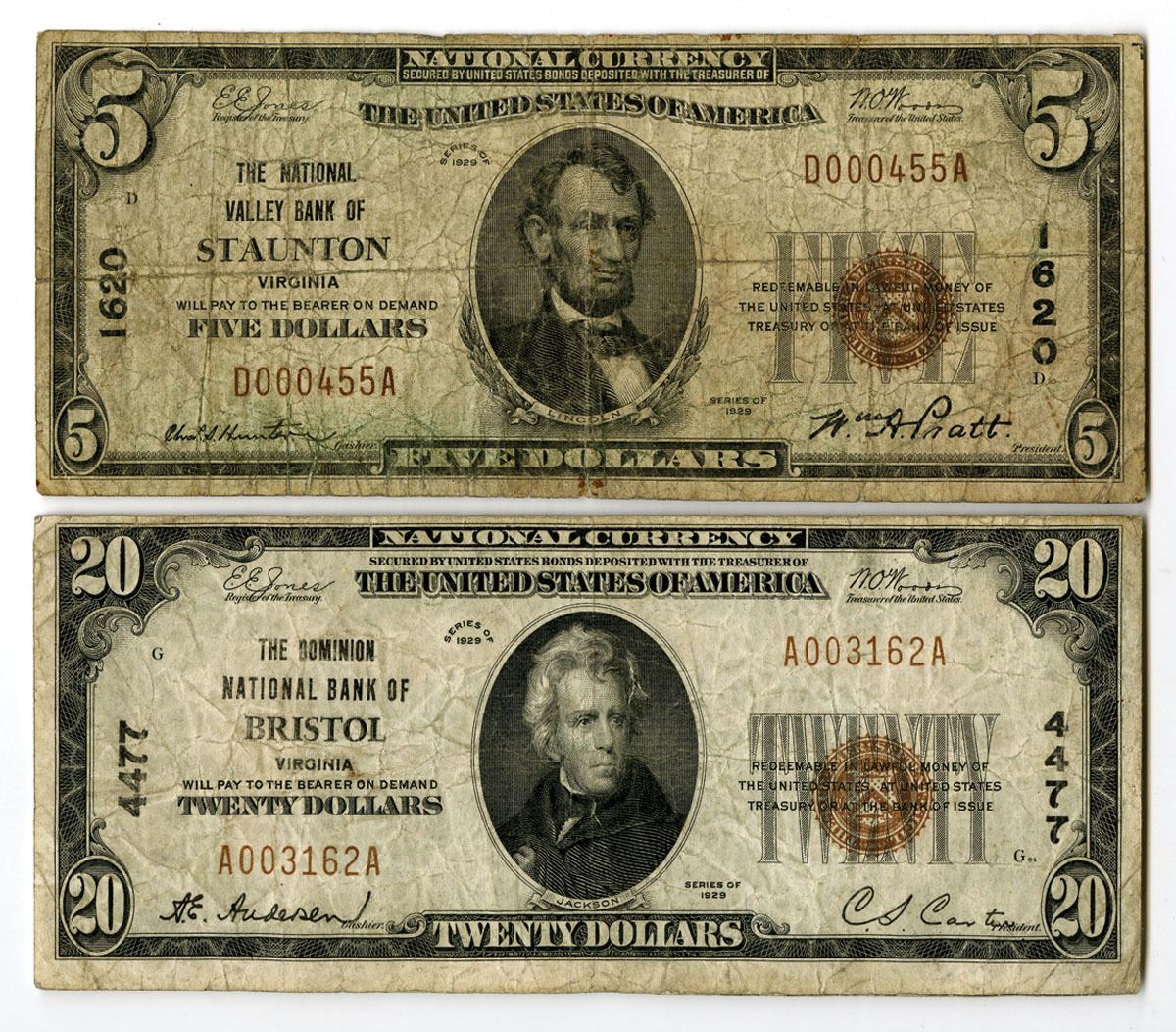 Virginia, 1929. Lot of 2 Issued Banknotes, Includes: Valley Bank of Staunton Virginia $5, Ch# 1620, Jones | Woods Signatures, Small brown seal at bottom right, S/N D000455A pp D20, lower right corner has tear and has been reinforced; Dominion National Bank of Bristol Virginia $20, Ch# 4477, Jones | Woods Signatures, Small brown seal at bottom right, S/N A003162A pp G84/93. Notes range from Good to VF+ condition. (2). Sold "AS IS" no returns accepted.