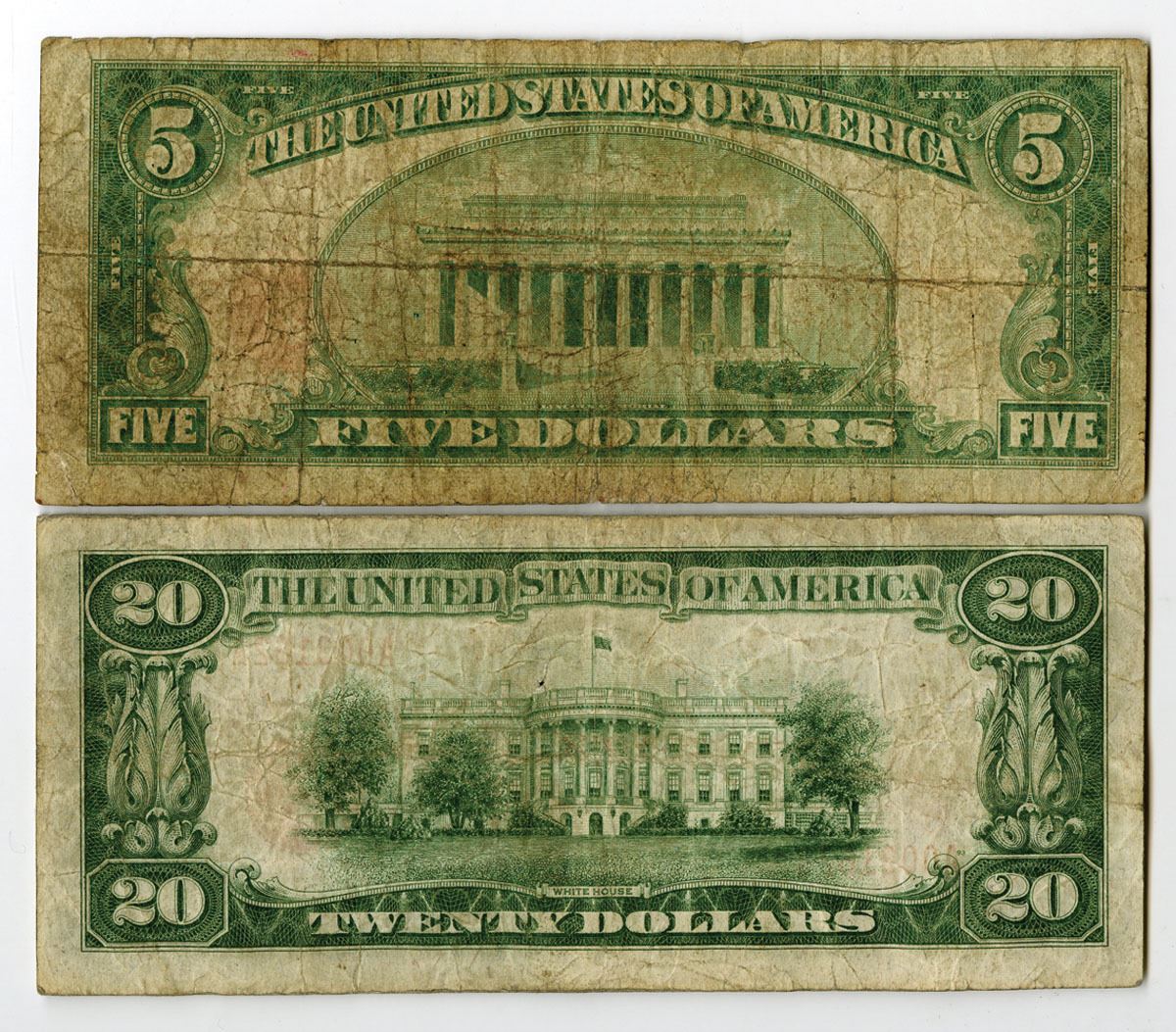 Virginia, 1929. Lot of 2 Issued Banknotes, Includes: Valley Bank of Staunton Virginia $5, Ch# 1620, Jones | Woods Signatures, Small brown seal at bottom right, S/N D000455A pp D20, lower right corner has tear and has been reinforced; Dominion National Bank of Bristol Virginia $20, Ch# 4477, Jones | Woods Signatures, Small brown seal at bottom right, S/N A003162A pp G84/93. Notes range from Good to VF+ condition. (2). Sold "AS IS" no returns accepted.
