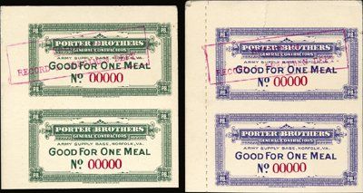 Virginia. ca.1900-1910's. "Army Supply Base, Norfolk, Virginia". 2 different specimen pair "Good For One Meal" scrip notes for a total of 4 notes. Back has vignette of old fashioned "Marion" Steam Shovel on railroad tracks. Notes are either olive green or purple. 3 are uncirculated and one has a bend in the card board cracking the border. Rare early military related scrip notes. ABNC