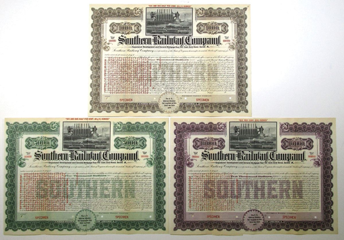 Virginia, 1906. Lot of 3, 4% Development and General Mortgage Series A Registered Bonds: $1000 with Brown border, $5000 with Green border, and $10,000 with Purple border. All have Specimen overprints, POCs, range from VF to XF condition, Bonds all have overprint extending interest by 2 1/2% printed by ABNC. (3). Sold "AS IS" no returns accepted.