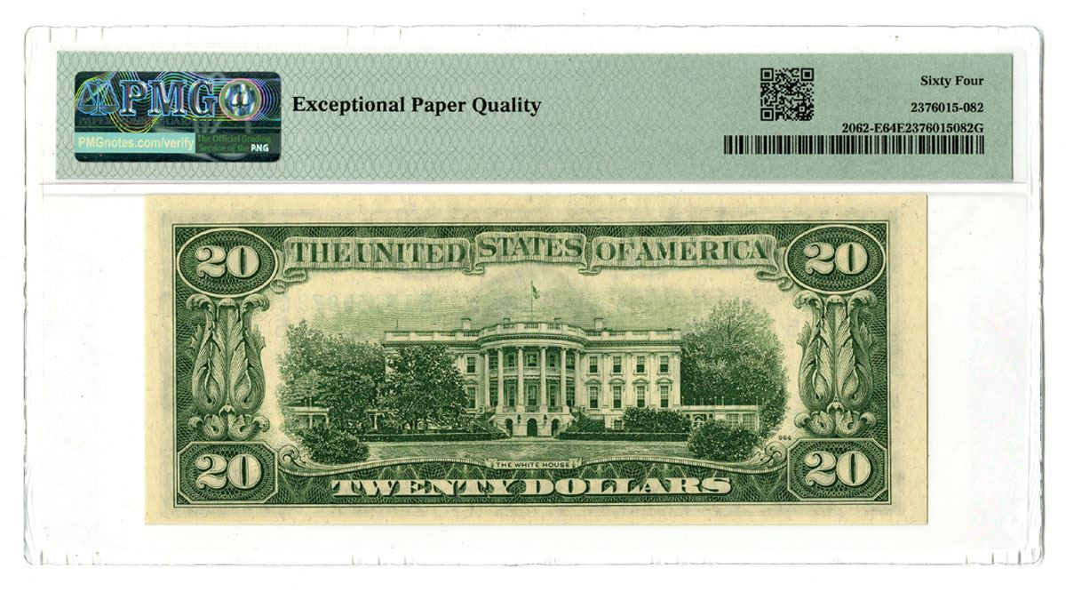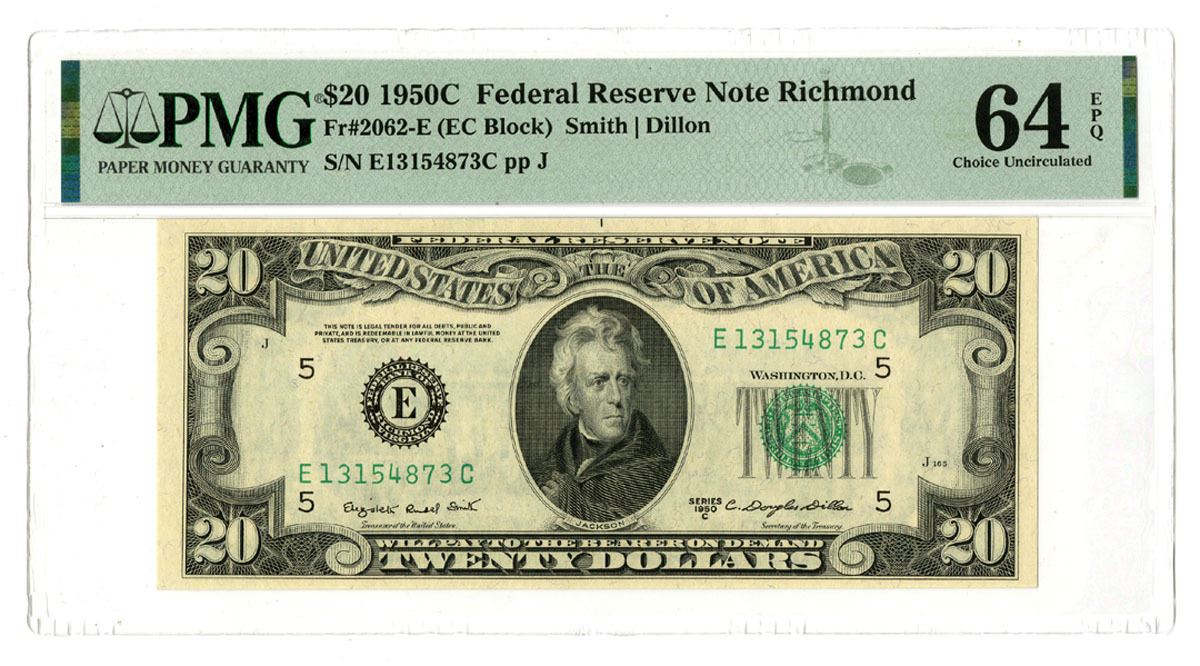 Richmond, Virginia, 1950. $20, Series of 1950C, Fr.# 2062-E, EC Block, Issued FRN Banknote, Green seal at right, Smith | Dillon signatures, S/N E13154873C pp J, PMG graded Choice Uncirculated 64 EPQ.