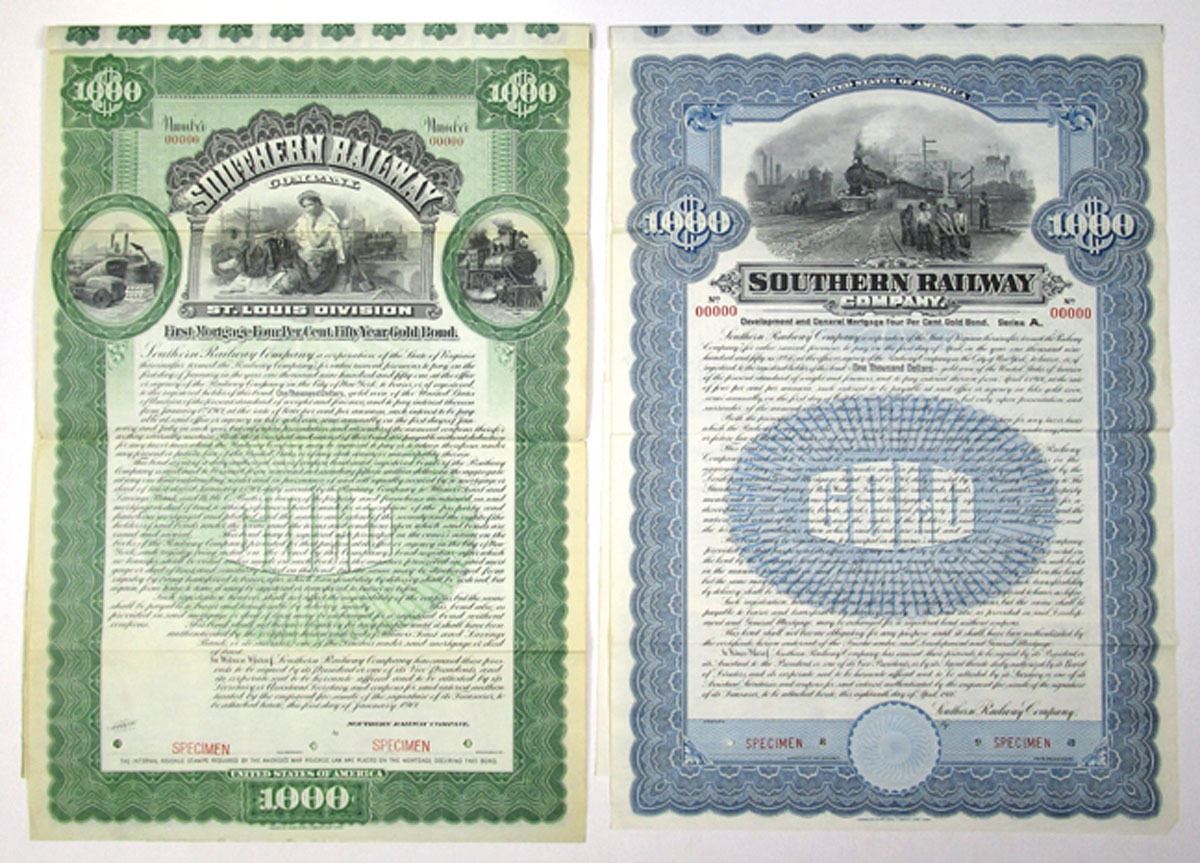 Virginia, 1901 and 1906. Lot of 2 Specimen Bonds, both are 4% Gold Coupon Bonds, Includes 1901, St. Louis Division $1000 First Mortgage Bond, green border with allegorical woman seated; 1906, $1000 General Mortgage Bond, blue border with group of railway workers being passed by train. Both have red specimen overprints, 00000 S/Ns and POCs. Condition ranges from Fine to VF, ABNC. (2). Only known as Specimens in Cox, no issued examples seen.