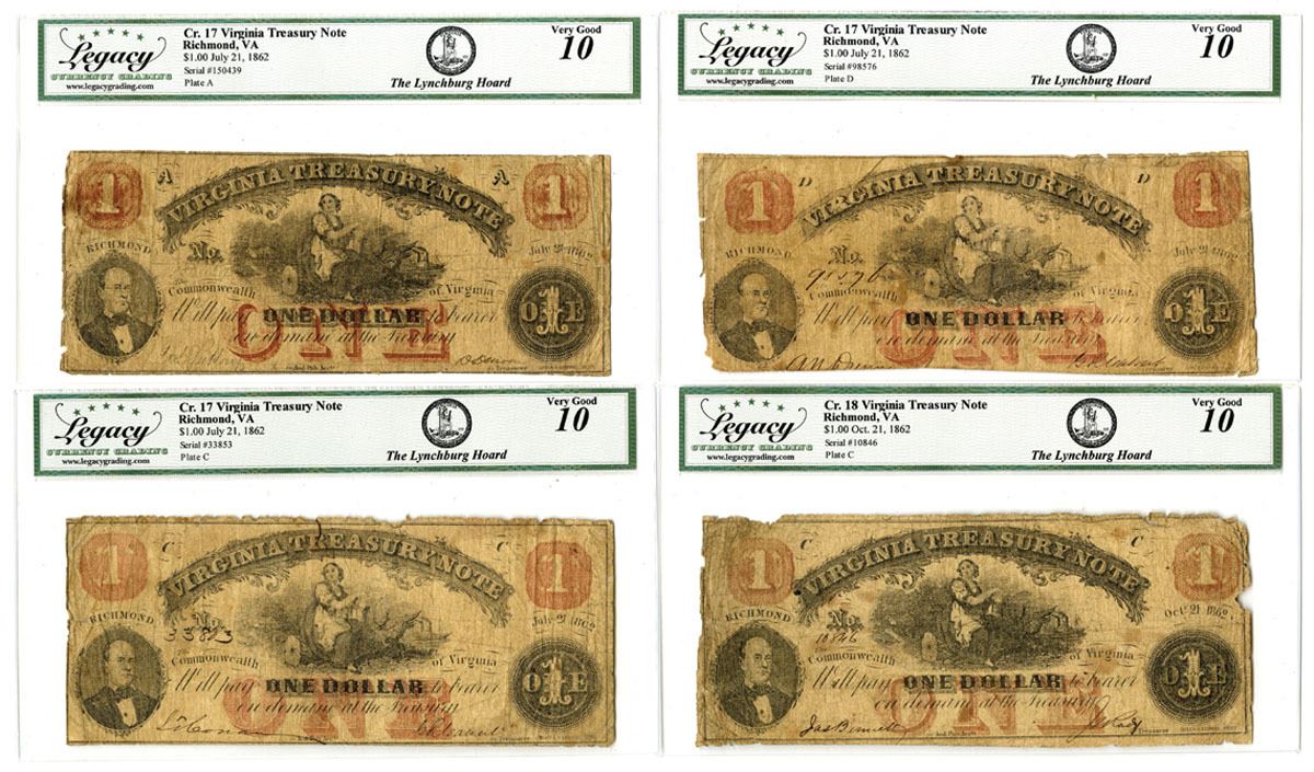 Richmond, Virginia, 1862. Lot of 4 Issued Banknotes, Includes: July 21, 1862 $1, P-S3681b (3) Cr. 17 and October 21, 1862 $1, P-S3681c Cr. 18. Notes are all Legacy graded Very Good 10 with different comments like "Small Edge Splits and Tears," Small Edge Nicks, Splits, and Tears," and "Minor Damage," K&B. (4). Sold "AS IS" no returns accepted.