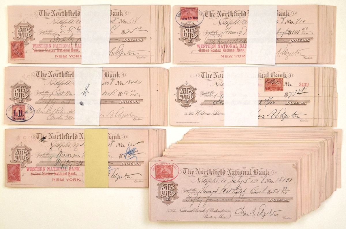 Northfield, Vermont, 1898-1901. Lot of 320+ bundled, large-format I/C Bank Checks, Checks are handwritten with completed amounts, serial numbers, dates, and original signatures, and each bears a revenue stamp, Group remains in original bundled form, reflecting period banking and clearing practices at the turn of the 20th century, Conditions range from VF to XF overall, with expected folds, edge wear, light handling, and cancellation markings. A strong banking ephemera group illustrating everyday interbank transactions in early 1900s New England. Sold “AS IS” no returns accepted.