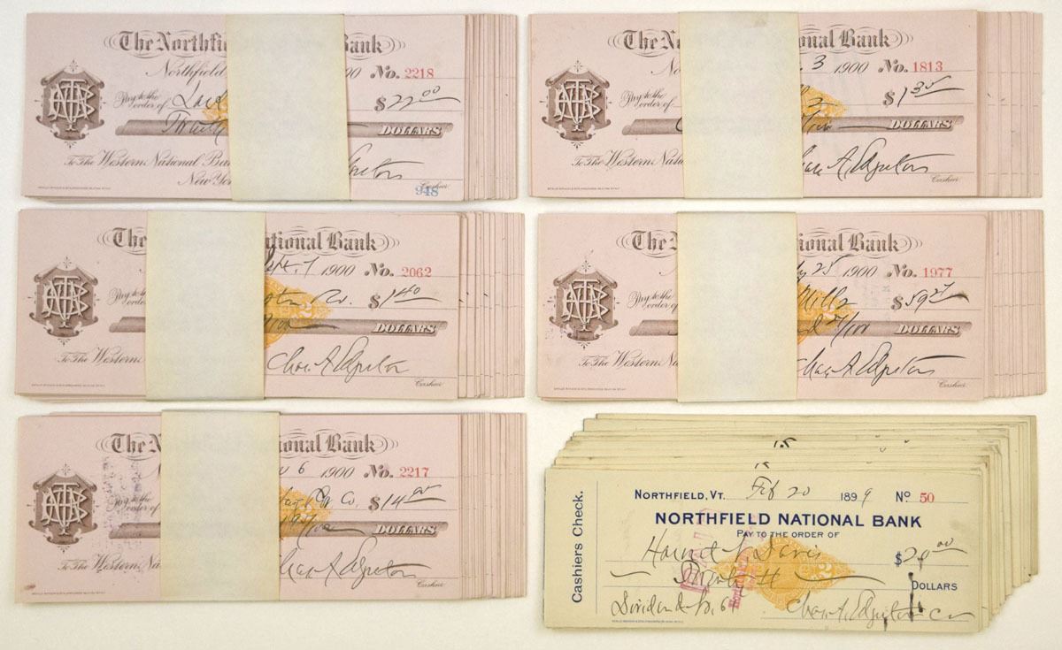 Vermont, 1899-1900. Lot of 180+ I/C National Bank checks drawn by Northfield National Bank, Group includes multiple bundles of standard bank checks along with a smaller group of cashier’s checks, all completed with handwritten dates, amounts, serial numbers, and original signatures, Checks have imprinted revenue stamps at center, Many have manuscript cancellations, clearing marks, and ink endorsements consistent with active commercial use. Printed on pink and buff period check stock typical of late 19th-century National Bank issues. Conditions range from VF to XF overall, with expected folds, edge wear, ink toning, and handling from routine banking transactions. (180+). Sold "AS IS" no returns accepted.
