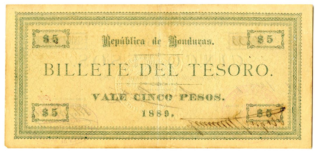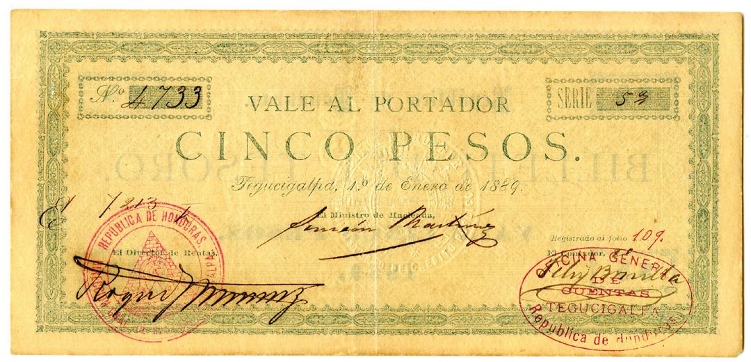 Tegucigalpa, Honduras Republic of Honduras, January 1st 1889, Series 5a, 5 Pesos, P-9, Gray-green with red overprints, embossed government seal and two hand stamps, "DALTONE" watermark, S/N 1015845, Choice VF to XF condition with small pin holes on left margin and a small area of ink burn on the left signature. This is the second note in this entire series this cataloger has ever seen. Rare, and unpriced in Pick as well as rarely seen this nice.