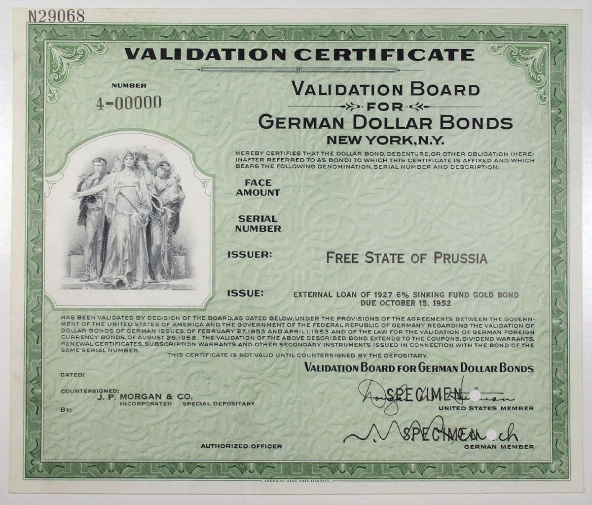 Germany (Issued in New York) 1927 (Issued in 1953). $-Odd Specimen 6% Sinking Fund Gold Bond Validation Certificate for German Dollar Bonds, Black text with green border and background, Trio of allegorical figures at left. Specimen overprints and POCs. VF condition, ABNC. These were issued to validate German securities that still had value after the war being held by foreign depositaries.