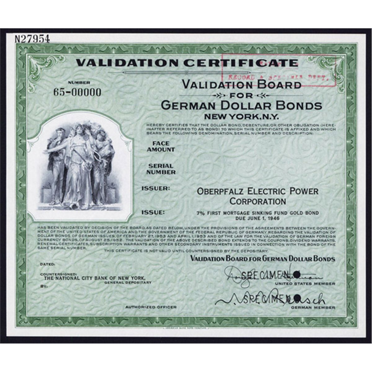 Germany - New York, 1953, Specimen certificate for Oberpfalz Electric Power Corporation, 7% Gold Bond, Black on green border and underprint, Allegorical figures on left, Specimen overprints, POC's. S/N 65-00000. Rare specimen certificate. ABNC.
