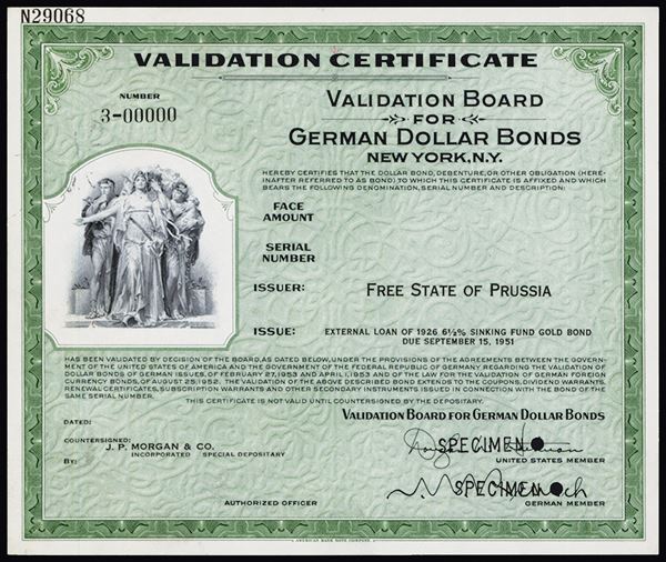 Germany - New York, 1953,$-odd, Specimen certificate for Free State of Prussia, External Loan of 1926 6 1/2% sinking Fund Gold Bond Due September 15, 1951, Black on green border and underprint, Allegorical figures on left, Specimen overprints, POC's. S/N 3-00000. Rare specimen certificate. ABNC.