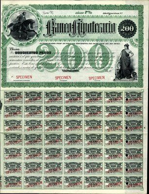 18--, ca.1883. 200 Pesos. Specimen Serie 7% Bond. Green border. Gaucho riding galloping horse on upper left and "Fortuna" allegorical woman and lower right. Red specimen overprints, POC's and "00000" serial numbers. VF condition. Coupons attached. Rare Chilean bond. ABNC.