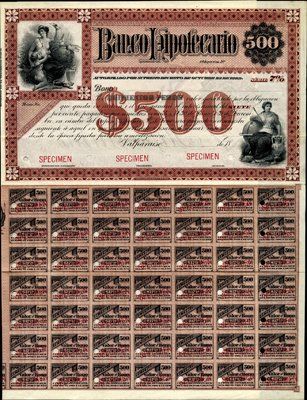 18--, ca.1883. 500 Pesos. Specimen Serie 7% Bond. Burgundy border. Allegorical woman with child and doves on upper left and seated allegorical woman with jar on lower right. Red specimen overprints, POC's and "00000" serial numbers. VF condition. Coupons attached. Rare Chilean bond. ABNC.