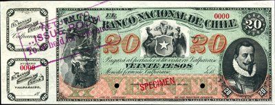 18-- (ca.1878-88). P-S335s. 20 Peso Specimen. Red specimen overprint, POC and "00000" serial numbers. Purple hand stamp on top right "Return to Issue Room To Be Held For Reference". Counterfoils on left. Unpriced in any from in Pick. Choice Unc. Rare note. ABNC.