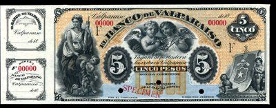 18--; (1881). P-S498 Unlisted. 5 Pesos Unlisted as a Specimen, Red specimen overprint, POC and "00000" serial numbers. Unc. Counterfoil on left. Note is unpriced in Pick and very rare. ABNC.