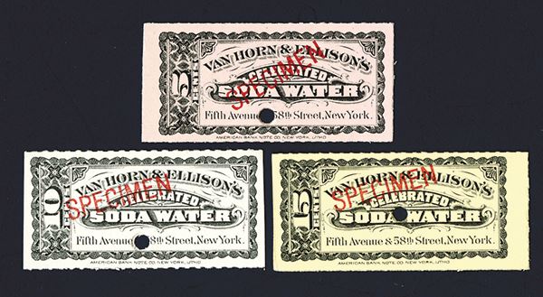 New York, NY. ND (ca.1870-1890's), 3 different specimen scrip notes, 5cts, 10cts and 15cts. Business was located at "Fifth Avenue & 58th Street, New York". Printed on different color thin cards. All with red specimen overprints and POC's. Uncirculated. Rare NY obsolete scrip notes or tickets.