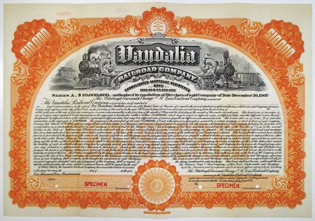 IN & IL 1907. $10,000 Specimen 4% Registered Consolidated Mortgage Bond, Black text with orange border and underprint, Train passing on tracks at top left and right corners. Red specimen overprints and POCs. VF condition, WBN. Unlisted color and denomination in Cox, Very Rare specimen.