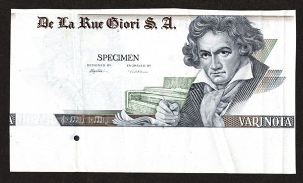 Italy. Polymer test note. Two sided, same design. Blind embossing at left end. Bottom edge note with misaligned printing registration bullet. Wrinkled in the course of testing and therefore Very Fine. Irregular cut. As made.