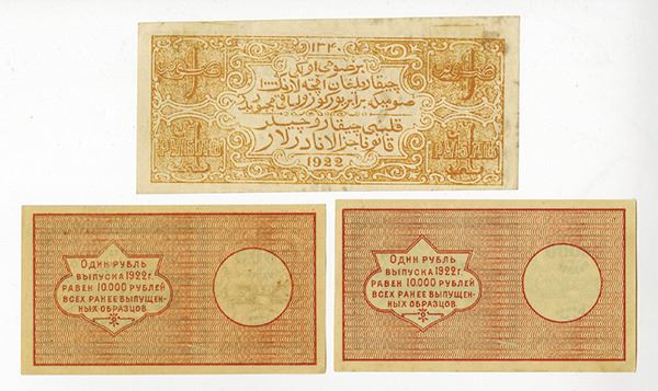 Russia (Central Asia), lot includes from Bukhara (Uzbekistan), 1 Ruble / 1 Som, 1923, P-S1046, Very Fine; and from Tashkent, issued by the Unification Cooperative "Pechatnik", a pair of exchange tokens for 1000 Rubles and 50000 Rubles, both Uncirculated.