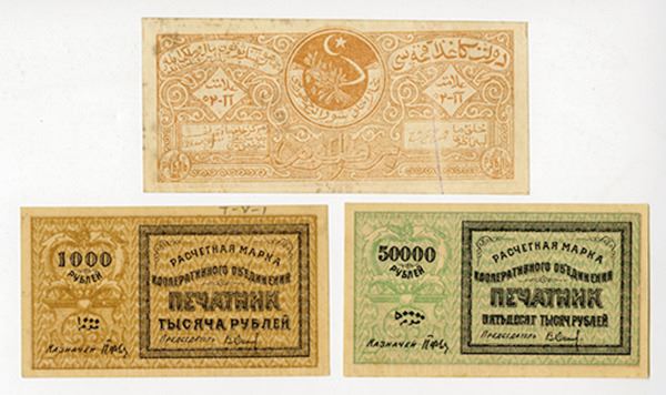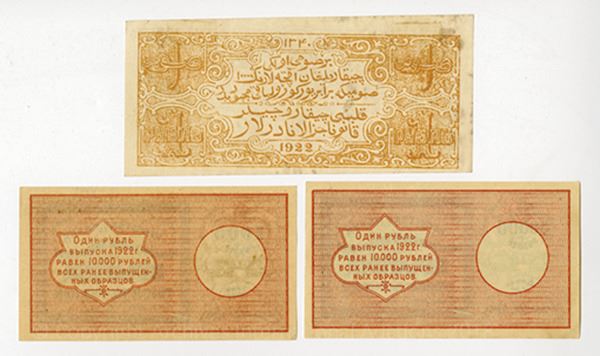 Russia (Central Asia), lot includes from Bukhara (Uzbekistan), 1 Ruble / 1 Som, 1923, P-S1046, Very Fine; and from Tashkent, issued by the Unification Cooperative "Pechatnik", a pair of exchange tokens for 1000 Rubles and 50000 Rubles, both Uncirculated.