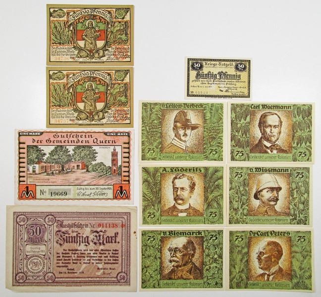 Germany. 1918-21, Lot includes an assortment of Notgeld featuring a set of colorful 75 Pfennig notes featuring colonies in Africa (6); various 50 Pfennigs including a "War Notgeld" 1918 issue; a 1 Mark from Quern; and 50 Mark from Rostock (Mecklenburg-Schwerin). VF to Unc. (11)