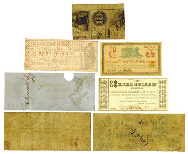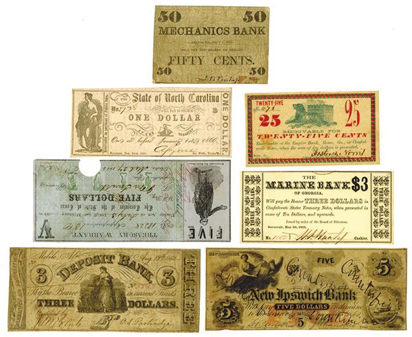 Mixed group of obsolete notes, includes New Ipswich Bank (NH) issue 5 Dollars, 1863, Fine; State of North Carolina issue 1 Dollar, 1866, About Uncirculated; Deposit Bank (AL) issue 3 Dollars, 1862, Very Good; Treasury of Texas issue 5 Dollars, 1862, Very Fine with POC; Marine Bank (GA) issue 3 Dollars, 1864, Uncirculated; Mechanics Bank (GA) issue 50 Cents, 1862, Fine; and Empire Bank (GA) issue 25 Cents, 1862, About Uncirculated.