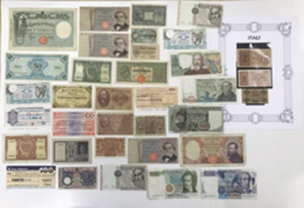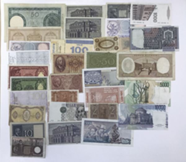 Italy, mixed group of mostly different government, military, and local issues, includes Banca Toscana 50 Centesimi, 1870, two different types, and another dated 1874; from the Allied Military Currency serie of 1943, issued 50 Lire, P-M14, Very Fine; Banca d'Italia issued 50 Lire, 1943, P-64, Very Fine; also included 4 issued checks for 100 Lire, 1976-1977. The balance of the lot are various modern 1, 2, 5, 10, 50, 100, 500, 1000, 2000, 5000, and 10000 Lire notes from the 1950s-1970s, generally VF to Uncirculated. Please inspect, sold as is.