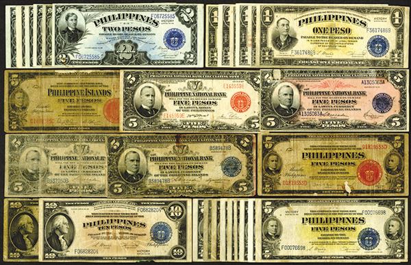 Philippines, group of notes, includes from the 1944 Victory Series, 1 Peso, P-94 (6 pcs); 2 Pesos, P-95 (6 pcs); 5 Pesos, P-96 (9 pcs); and 10 Pesos, P-97. Also included from other series, 5 Pesos, 1916, P-46b; 5 Pesos, 1921, P-53 (2 pcs); 5 Pesos, 1929, P-75 (2 pcs); 5 Pesos, 1937, P-57; and 10 Pesos, 1936, P-84a. Generally Fine to VF. Please inspect.